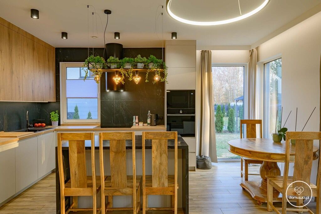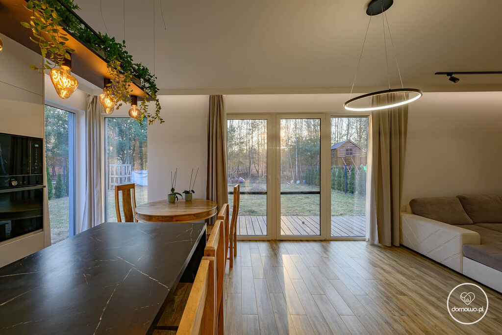 -> Duży salon z aneksem kuchennym, wyspą i panoramicznymi oknami,